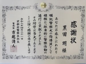 そして黒田所長に京都府警察本部長より永きにわたり嘱託警察犬の指導員として警察活動の遂行に貢献したとして![]()