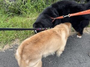 お散歩中に会うとすぐに興奮してしまうのでビックリマーク